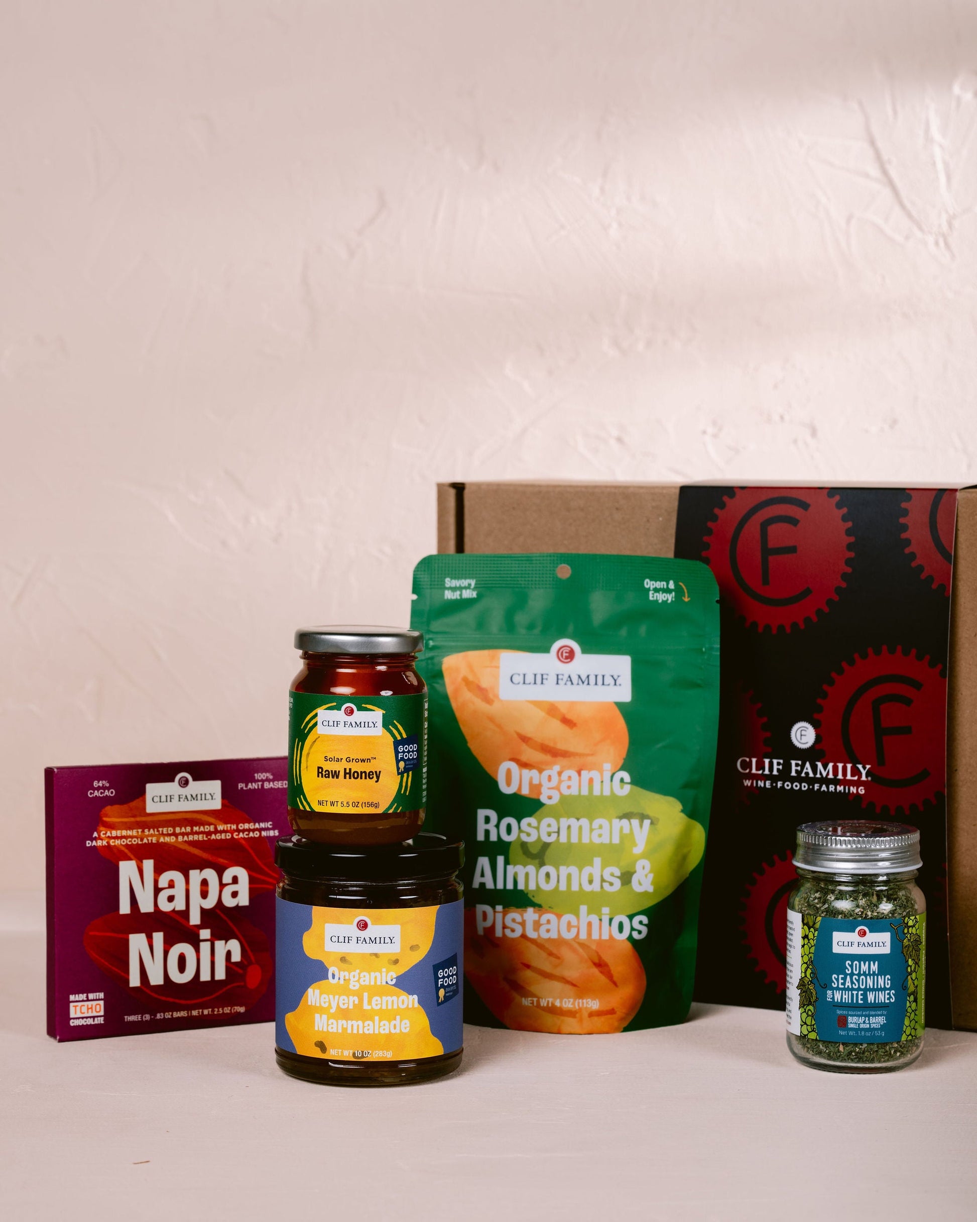 Share a taste of Napa Valley with this curated collection of happy hour essentials. Inside, is everything needed for a celebratory cheese board: Organic Rosemary Almonds & Pistachios, a Napa Noir Dark Chocolate bar, Organic Meyer Lemon Marmalade, White Wine Somm seasoning, and Solar Grown™ Raw Honey.