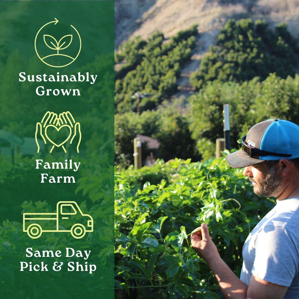 This limited-edition box of California Passion Fruit features 4 to 5 pounds (approximately 20–30 pieces) of Passion Fruit, lovingly-harvested on our family ranch in Santa Paula, California. ✨
