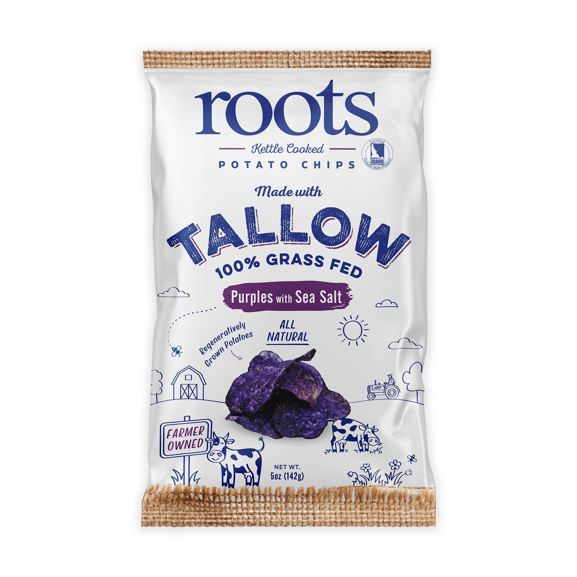 Buttery, smooth, and undeniably crisp. Roots Tallow Purple Sea Salt Kettle Cooked Potato Chips are handmade from regeneratively grown Idaho purple potatoes and cooked in 100% pure tallow for a rich, golden crunch. Naturally vibrant and lightly salted, they deliver clean flavor, deep color, and the kind of satisfying bite only real food can offer.