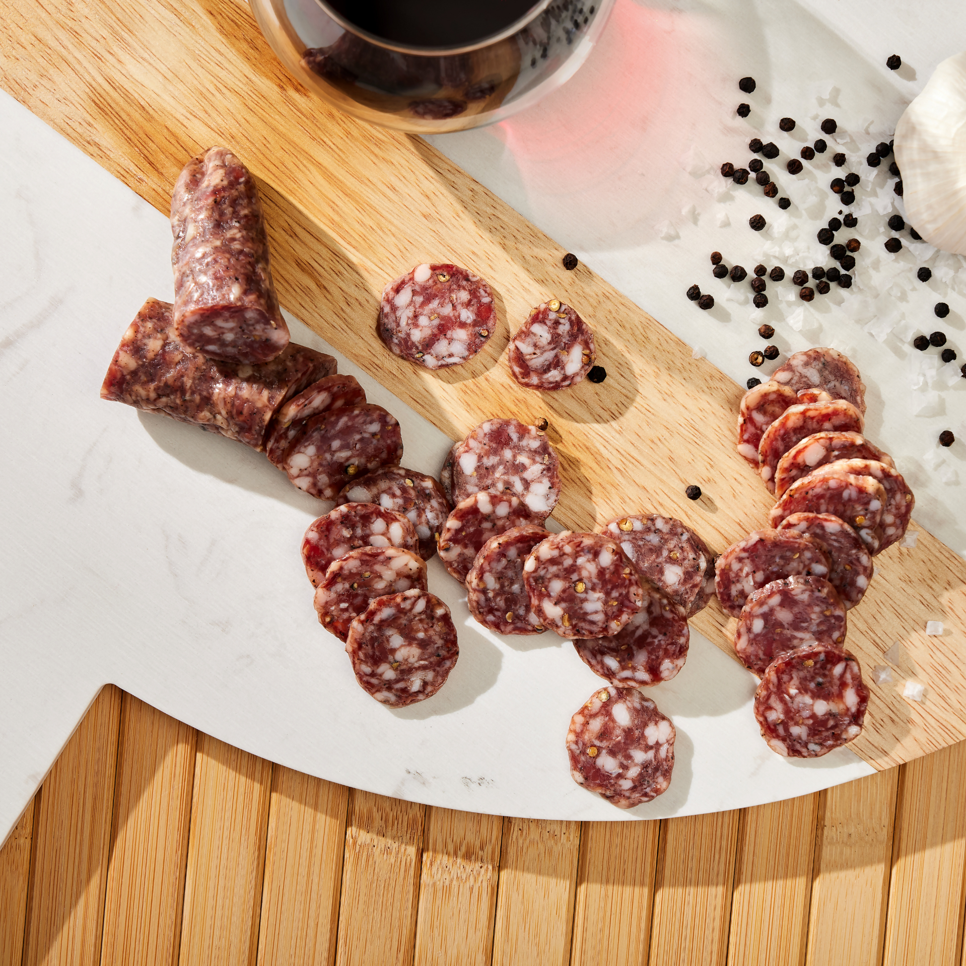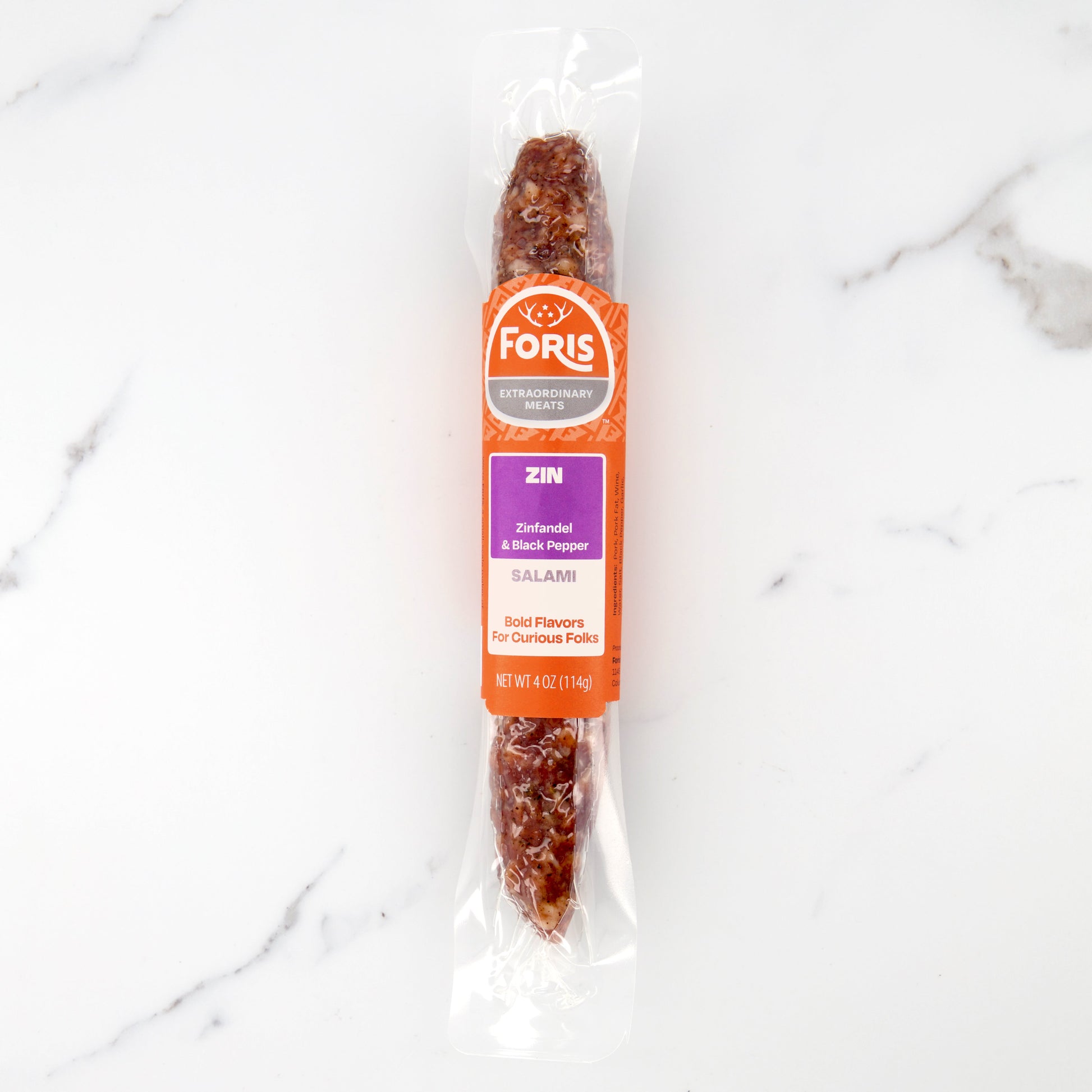 Zinfandel & Black Pepper. Ripe with Wine Country flavor. Old-vine wine lends elegance in this unique peppery salami flavored with cracked pepper with hints of garlic.
